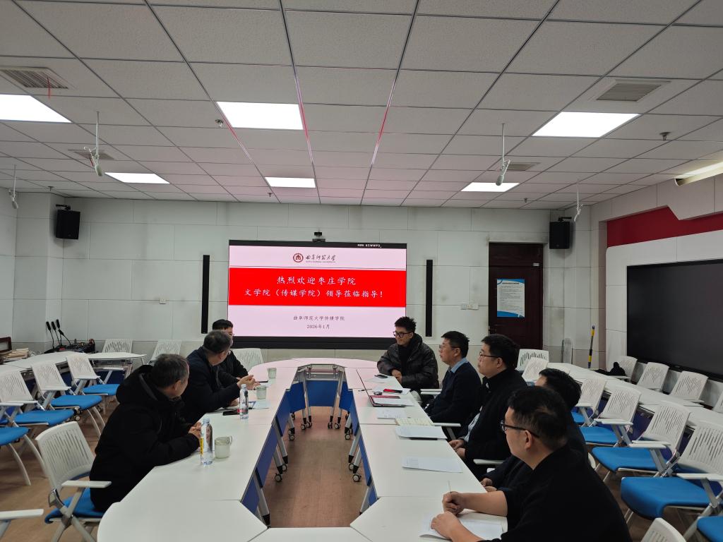 )院长张爱民、副院长郑亚鹏及广播电视编导专业负责人张宪席一行来我院进行考察交流。我院党委书记田维柱、院长王焕景以及戏剧与影视专业骨干教师代表参加活动。